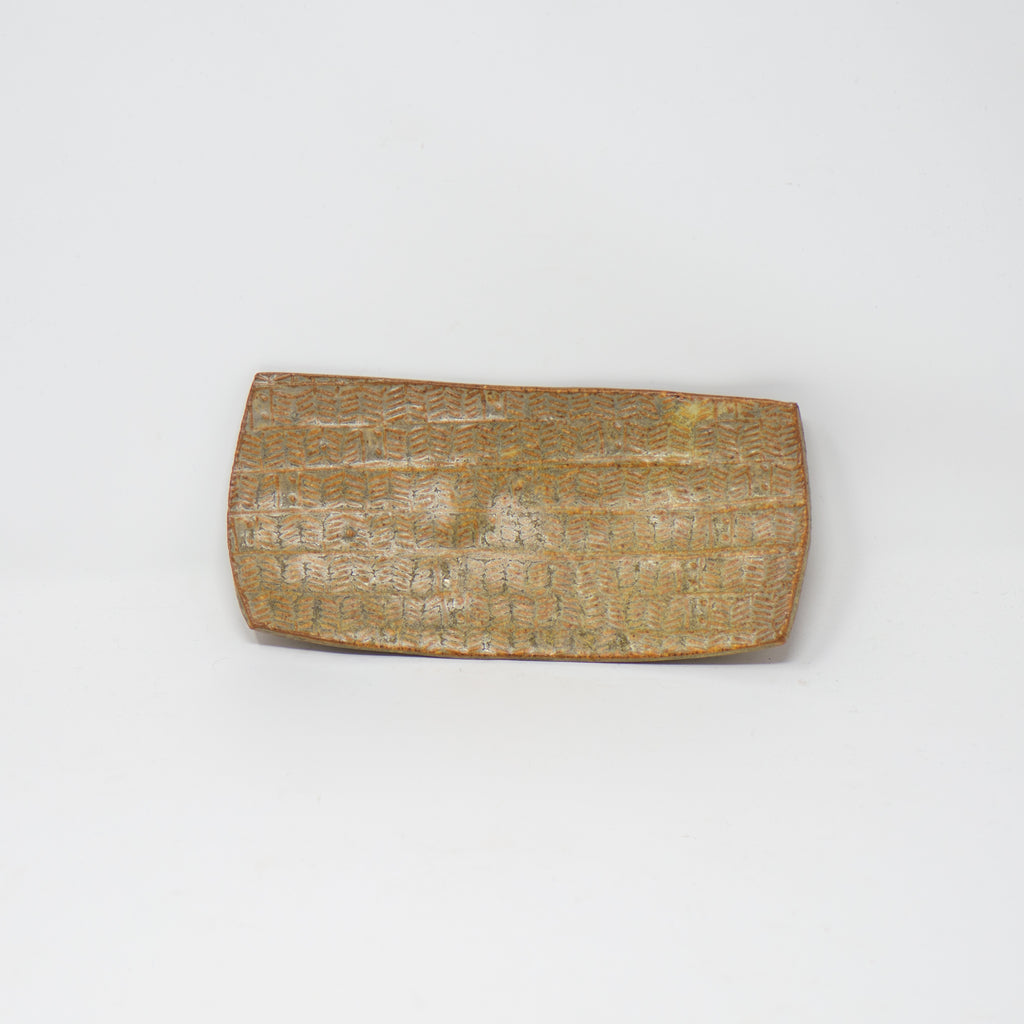 This one-off soap dish is pleasingly simple in design with subtle texturing along its top. About 6" long and 3" wide.